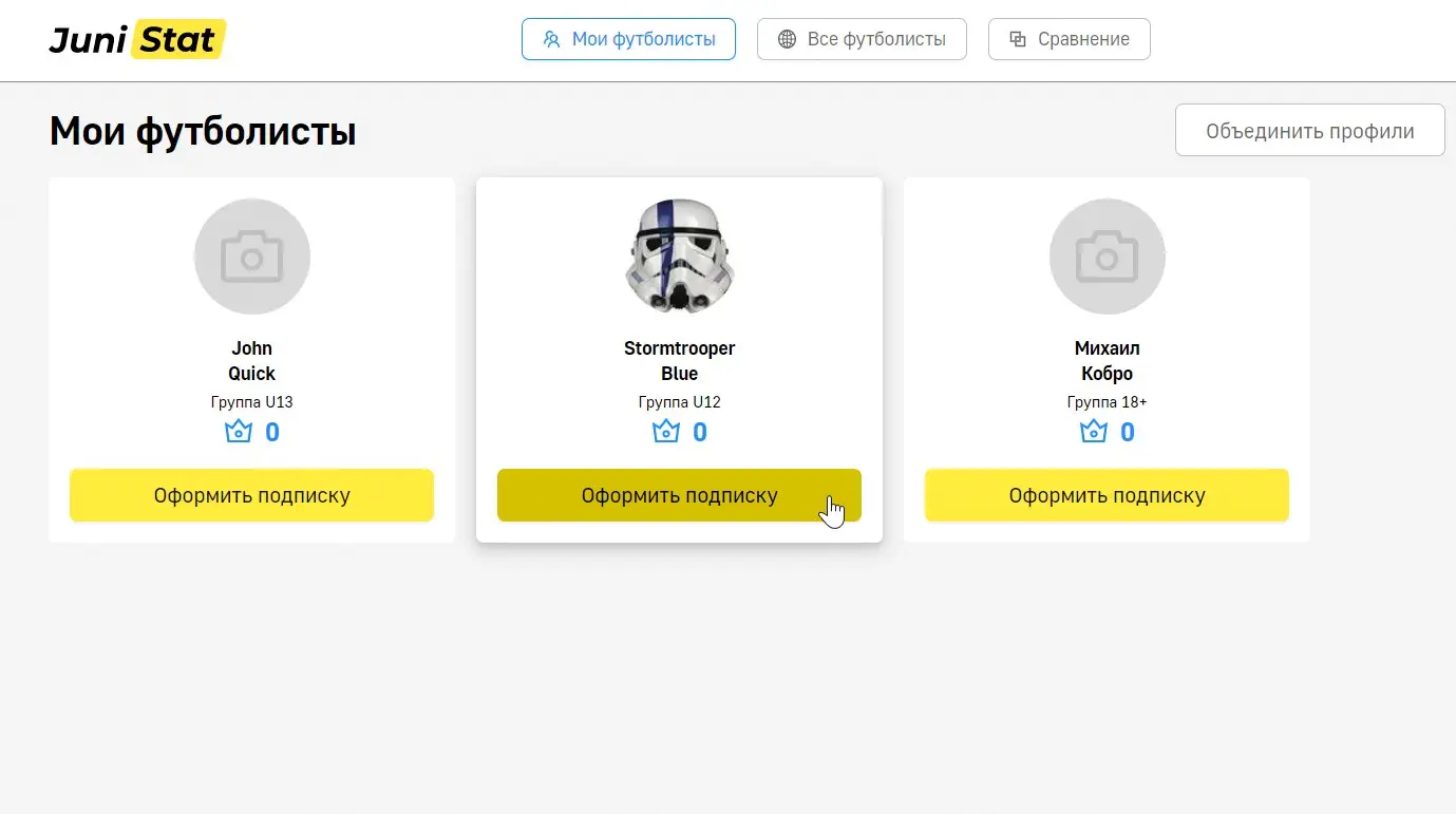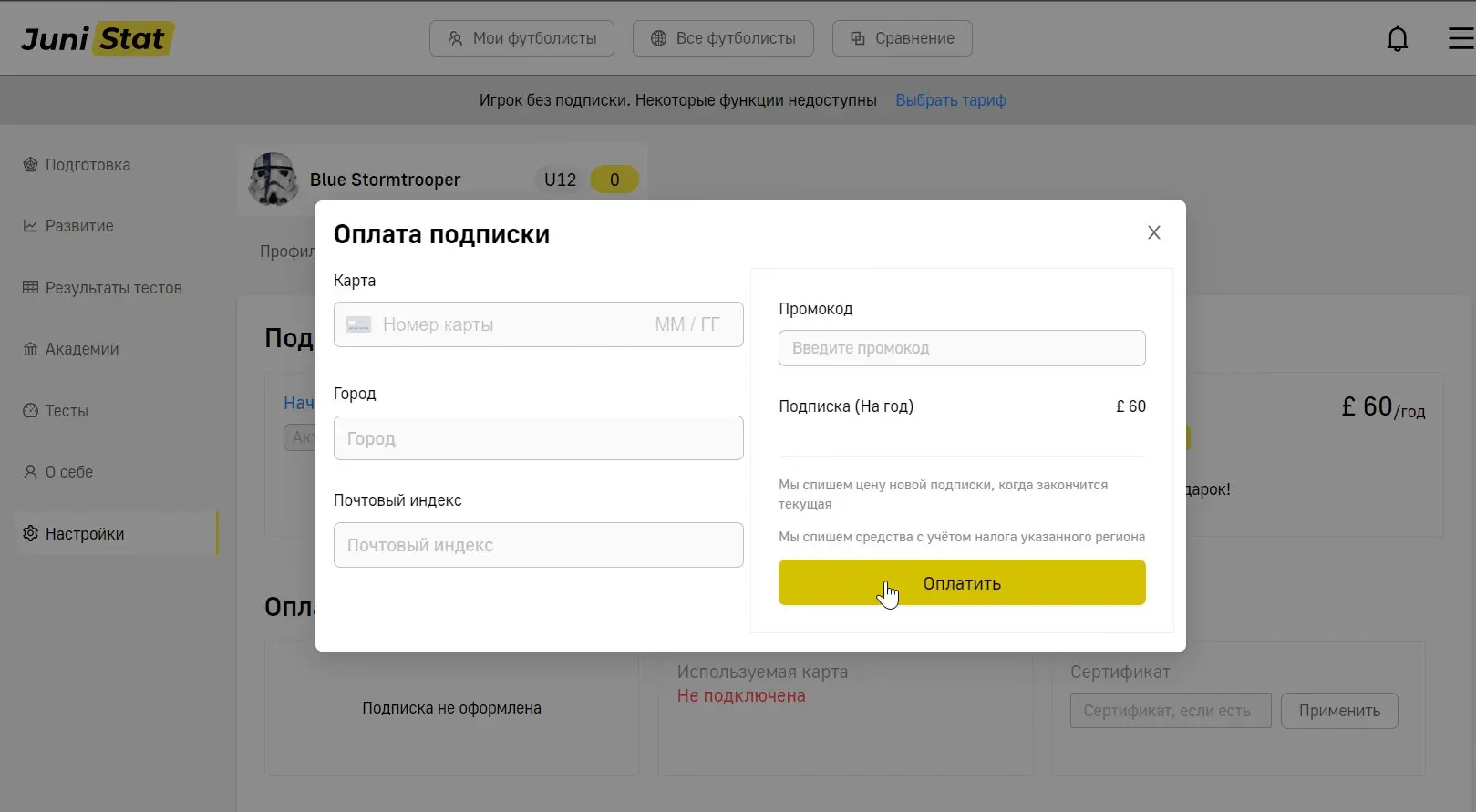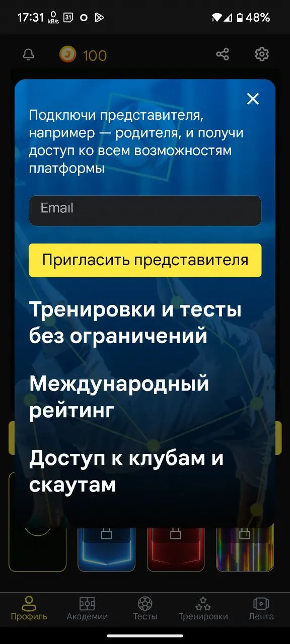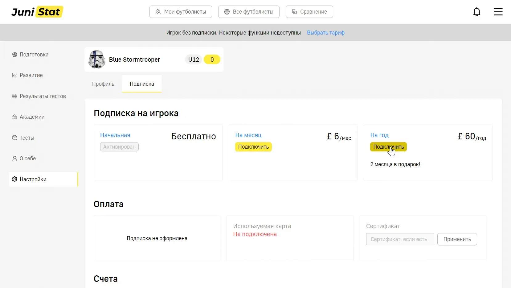 Подписка открывает доступ ко всем тестам. Возможность сделать игрока открытым для просмотра академиями и клубами.